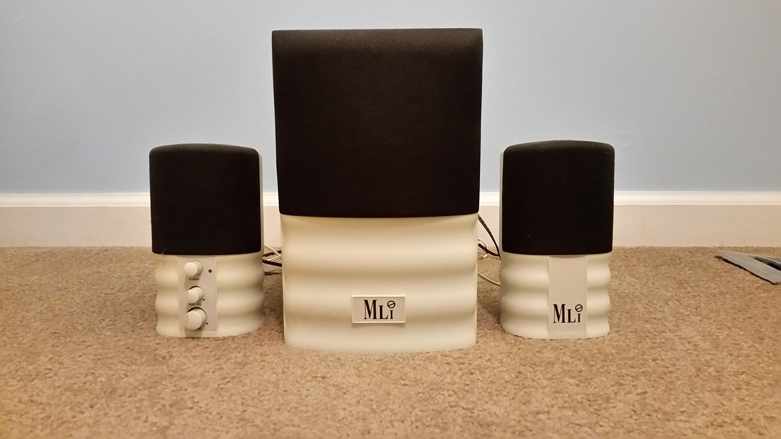 Figura 1: Sistema di altoparlanti per computer a 2.1 canali Midiland MLi-SW190. Questa immagine mostra la configurazione completa degli altoparlanti, con due altoparlanti satellite compatti posizionati ai lati di un subwoofer centrale più grande. Gli altoparlanti satellite presentano griglie nere e basi bianche con manopole di controllo. Anche il subwoofer presenta una griglia nera e una base bianca, con il logo "MLi" visibile sulla parte anteriore.