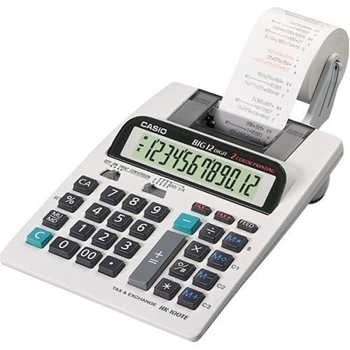 Image: The Casio HR-100TEPlus Printing Calculator, showcasing its full keypad, 12-digit LCD display, and integrated paper roll for printing calculations. The device is white with black and teal buttons.