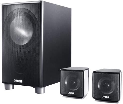 Image: The Canton DM 2 Home Cinema System, featuring a large black subwoofer on the left with silver feet, and two smaller black satellite speakers on the right, each with a mesh grille. This image illustrates the primary components of the 2.1 channel system.