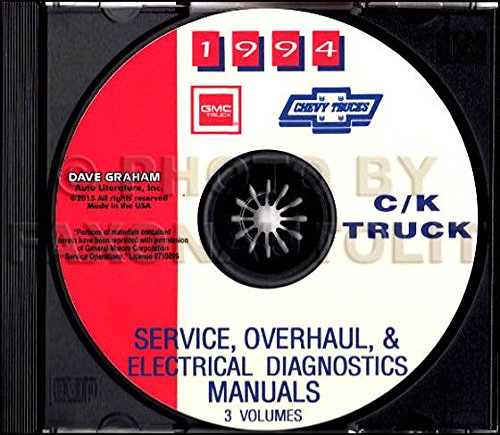This image displays the cover of the 1994 Chevrolet C/K Truck Service, Overhaul, & Electrical Diagnostics Manuals CD. The disc features the year '1994', 'GMC' and 'Chevy Trucks' logos, and text indicating 'C/K TRUCK SERVICE, OVERHAUL, & ELECTRICAL DIAGNOSTICS MANUALS 3 VOLUMES'. The CD is housed in a black jewel case.