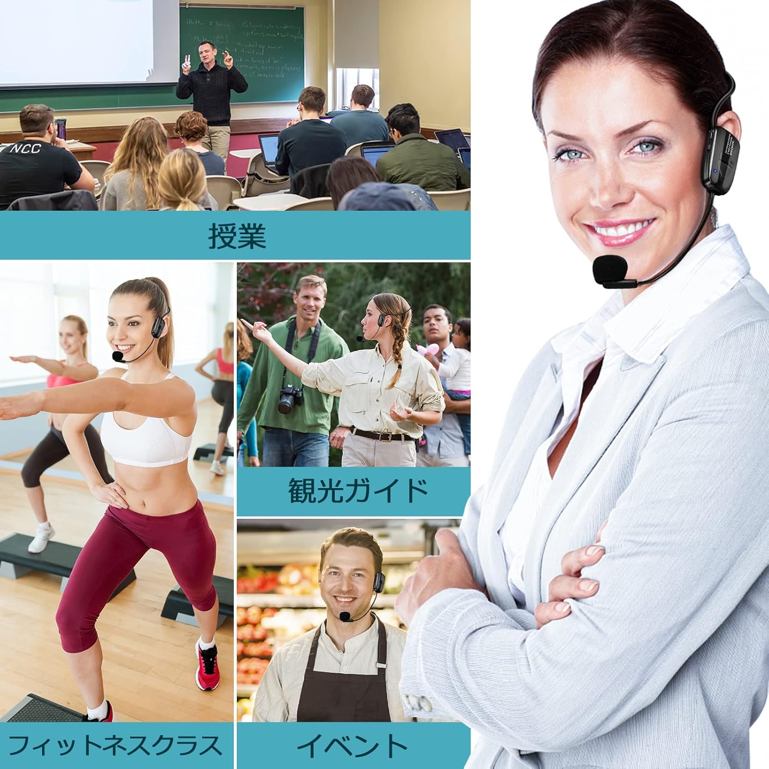 Image: The XIAOKOA 2.4G Wireless Headset Microphone being used in various scenarios including teaching, fitness classes, tour guiding, and events, demonstrating its versatility and hands-free design.
