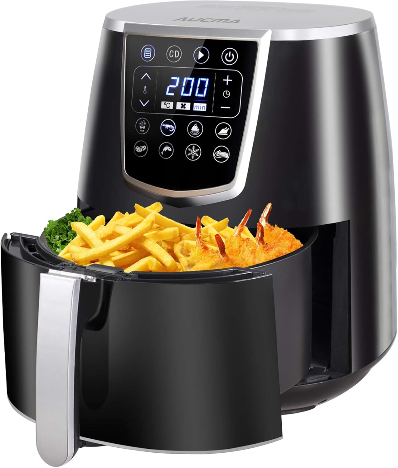 Immagine 2.1: La friggitrice ad aria automatica AUCMA, mostrataasinil suo design e il cestello di cottura pieno di patatine fritte e gamberetti.