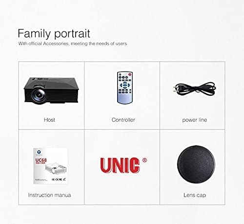 Image: The Unic UC68 projector package contents, showing the main unit, remote control, power cord, instruction manual, and lens cap.