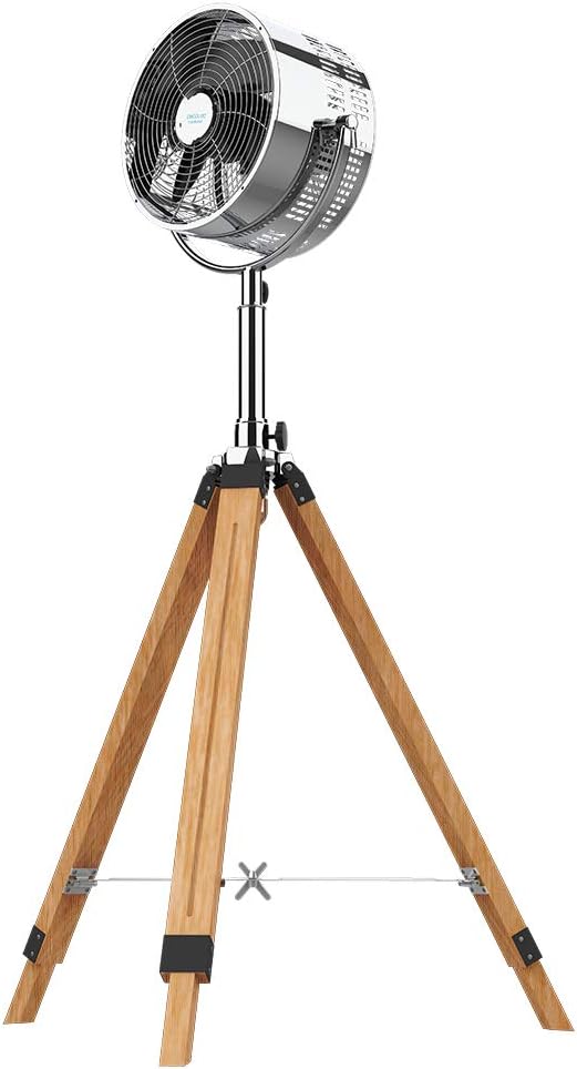 Immagine: Ventilatore a piantana Cecotec EnergySilence 1200 Woody completamente assemblato, mostratoasincon la sua base a treppiede in legno e la testa a ventaglio cromata.