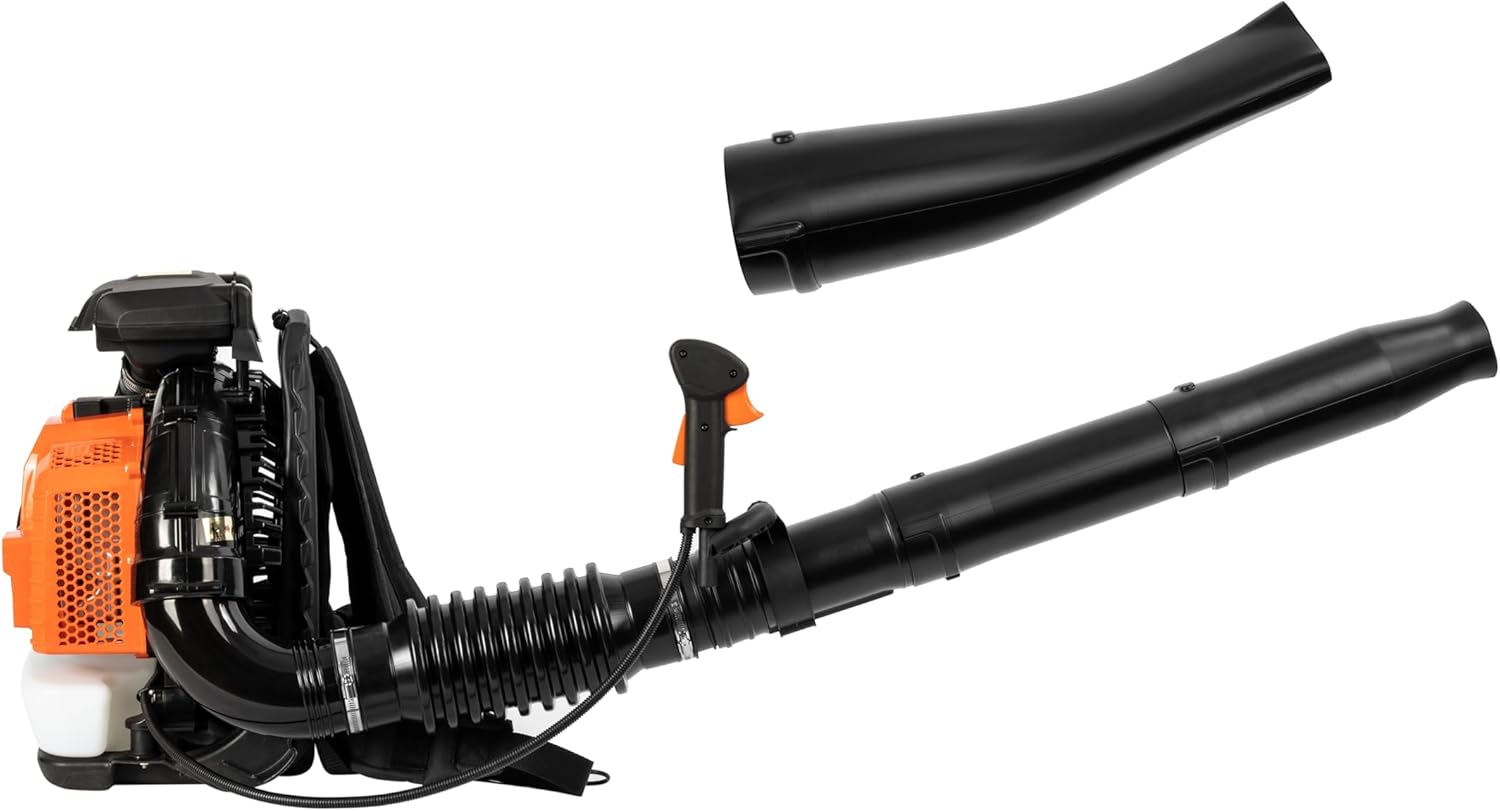 Wear the backpack blower using the ergonomic harness system. Adjust the shoulder straps, chest strap, and waist belt for a comfortable and secure fit. The adjustable handle allows you to position the blower tube for optimal control and reduced arm fatigue.