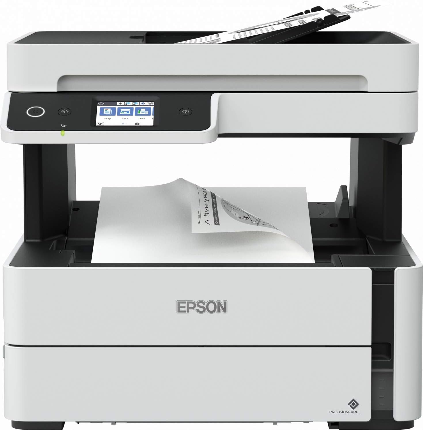 Figura 2.1: Davanti view della stampante EPSON EcoTank M3140, che mostra il pannello di controllo, l'ADF e il vassoio di uscita della carta.
