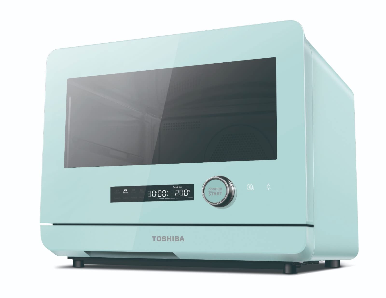 Figura 1: Davanti view of the Toshiba MS1TC20SF Steam Toaster Oven. The digital display shows time and temperature settings, with a 'CONFIRM START' knob on the right.