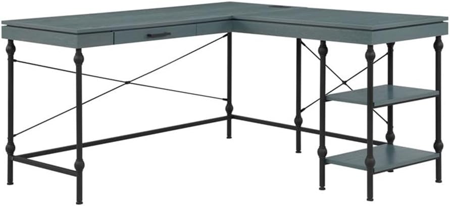 The Furniture of America Diego L-Shaped Wooden Desk is designed to enhance your workspace with its functional corner layout and antique blue finish. It provides ample surface area for various tasks and includes integrated features for convenience.