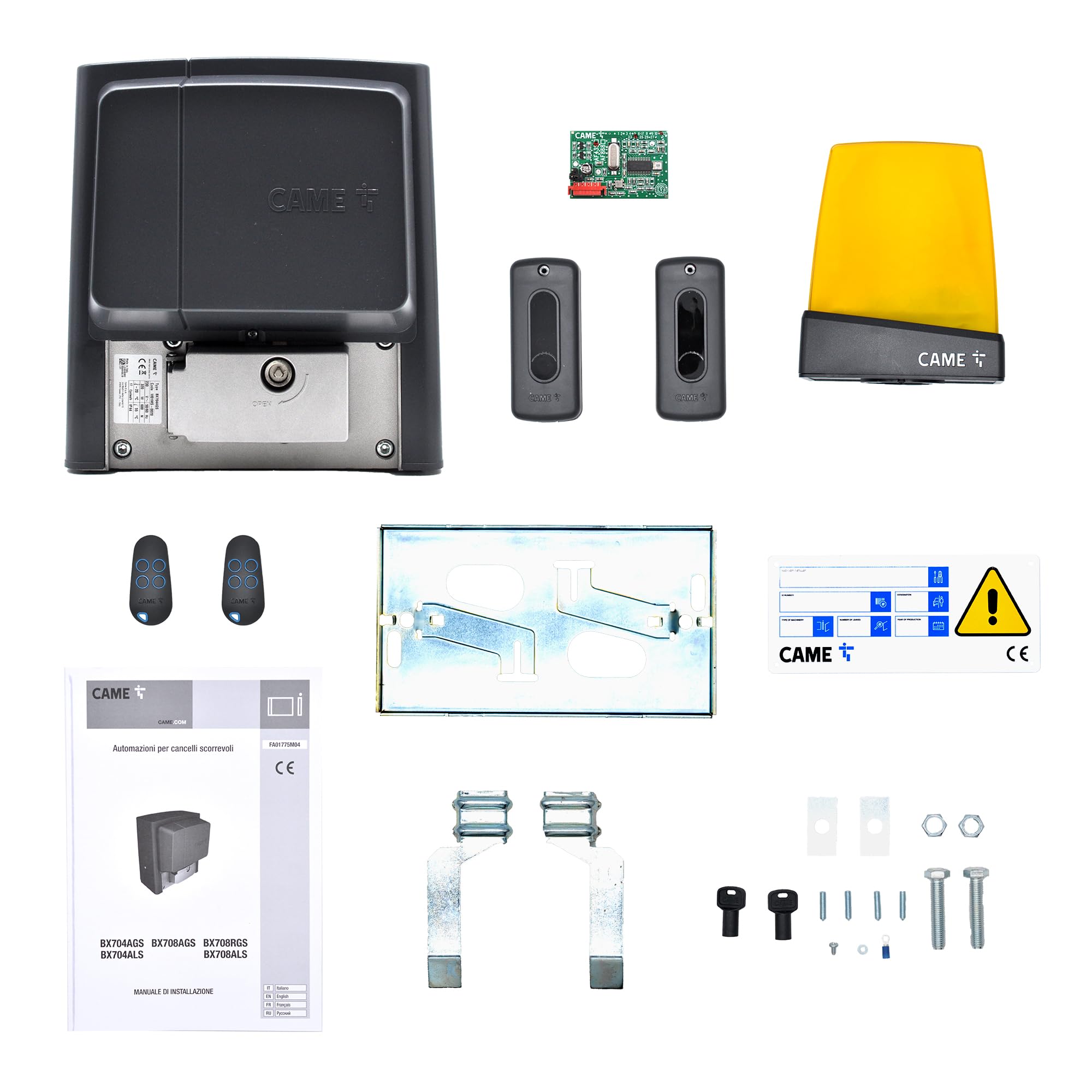 - 801MS-0020 BX704AGS Automation Unit: This is the core motor and control board for sliding gates up to 400 kg and 14m length. It features a programming display, integrated radio decoder, movement control, obstacle detection, and mechanical limit switches.