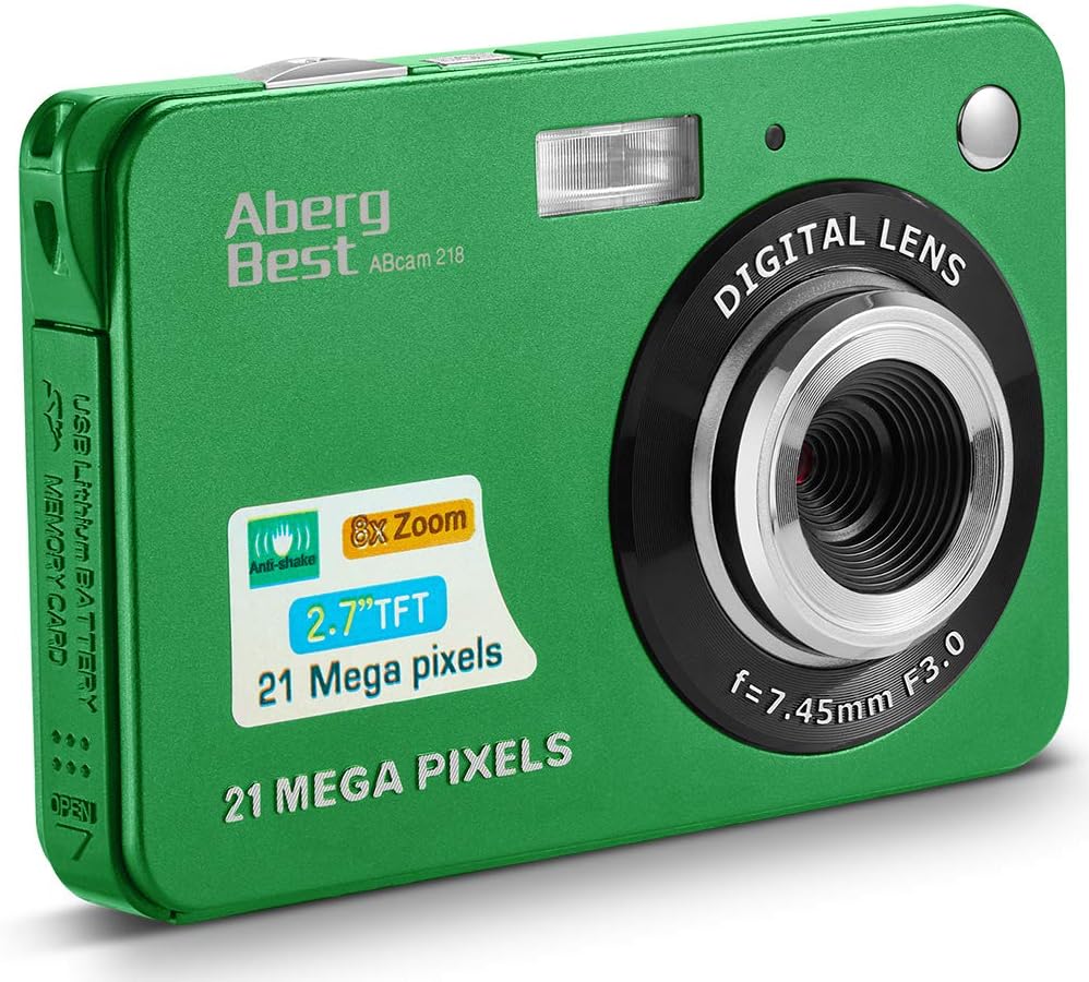 The AbergBest Mini Digital Camera features a durable plastic body and a 2.7-inch TFT LCD screen, designed for easy handling and clear viewing.