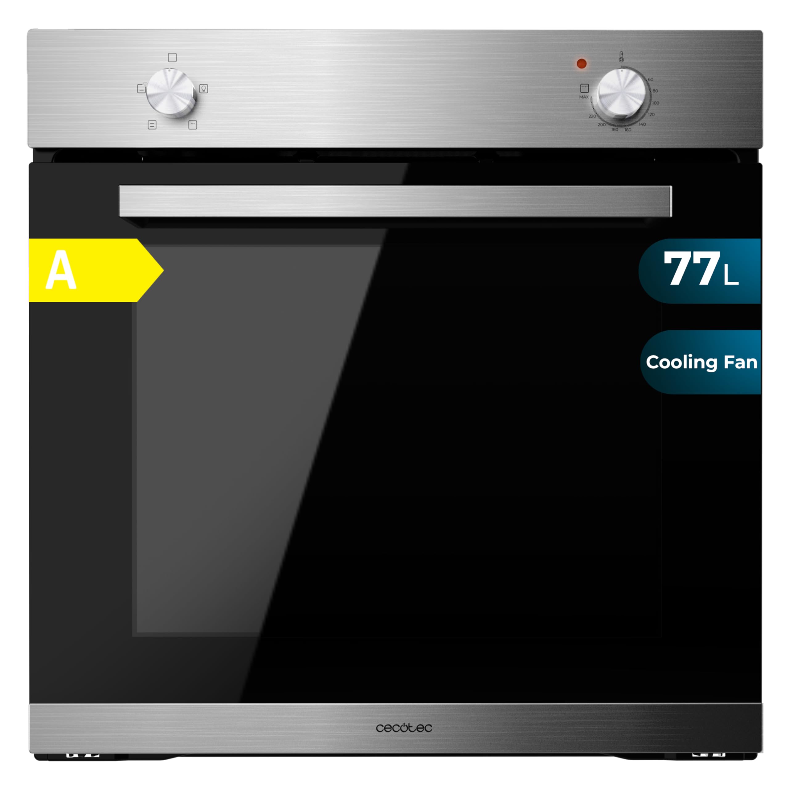 Davanti view del forno da incasso Cecotec Bolero Hexa C126000 Line+, evidenziandone la classe di efficienza energetica e la capacità di 77 litri.