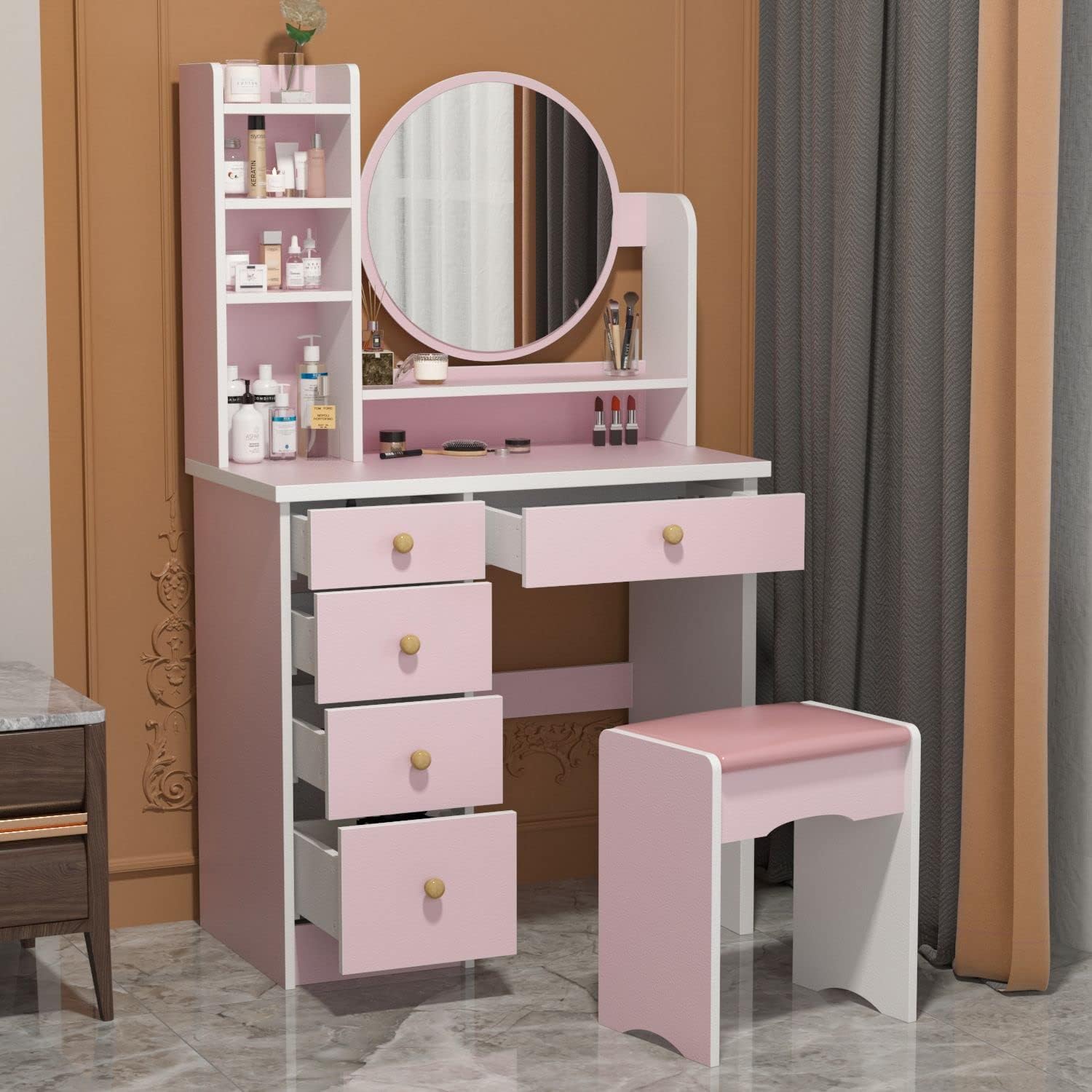 - Varieties of Storage Space: The vanity set offers different sizes of drawers and shelves for organizing cosmetics, nail polish, perfume, eyeliners, and other items.