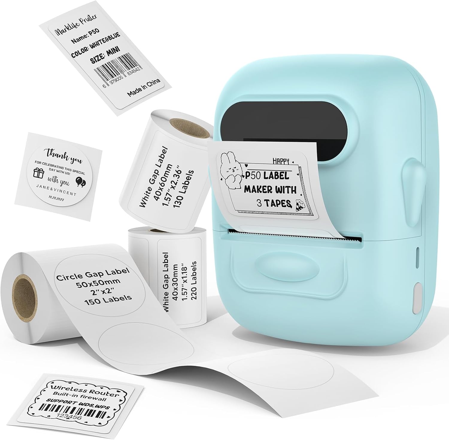 Image: The MARKLIFE P50 Label Maker Machine shown with three rolls of label tape of different sizes and shapes, demonstrating the variety included in the package.