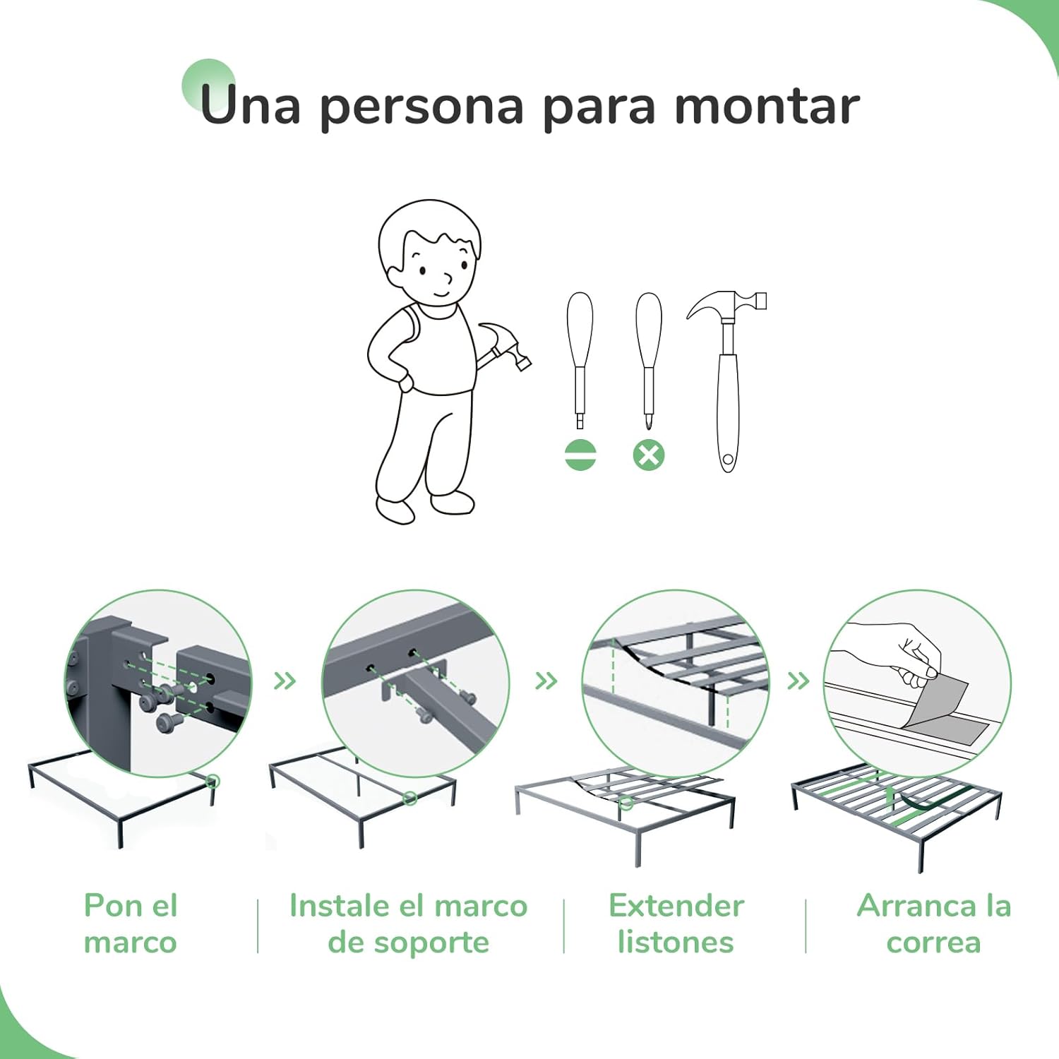 Figura 3.1: An illustration depicting the various components and tools required for assembly, including the metal frame, wood slats, and basic tools like a hammer and screwdriver (though typically an Allen key is provided).