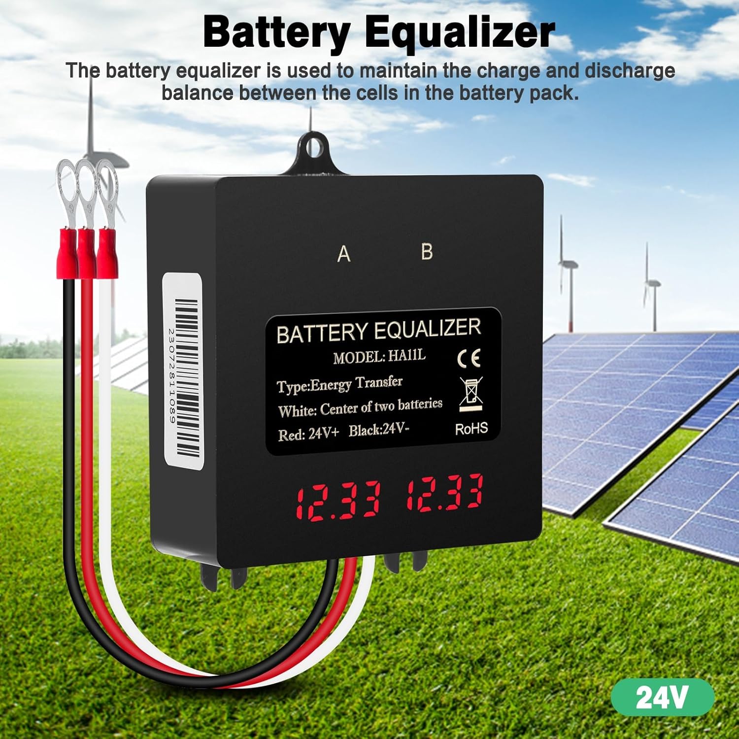 The equalizer is designed for 24V battery banks, typically consisting of two 12V batteries or four 6V batteries connected in series.