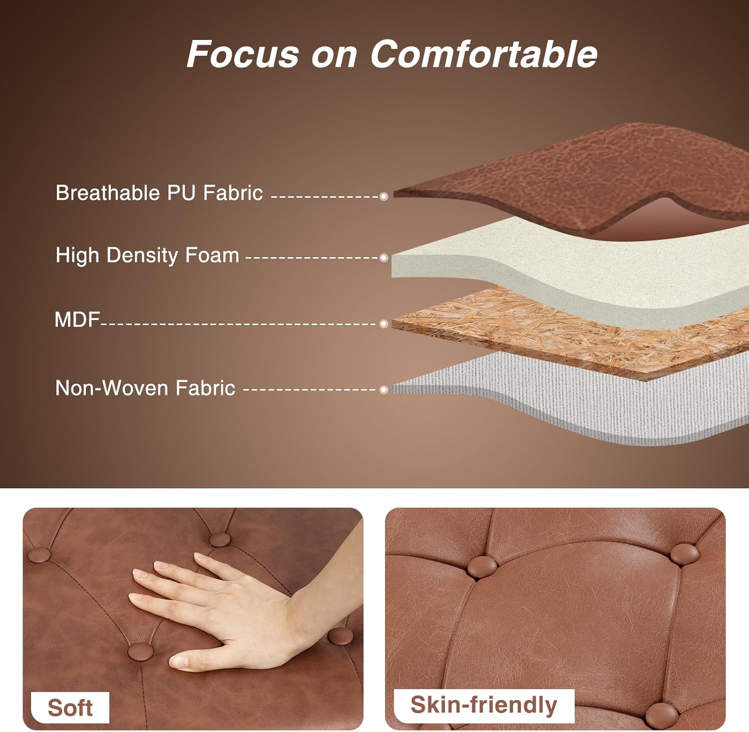 Thank you for choosing the FiveWillowise 55-inch Bedroom Storage Bench. This versatile and stylish piece of furniture is designed to enhance your living space with both comfort and practical storage. Featuring unique rolled armrests, rivet trim, tufted buttons, and a durable faux leather cover, it offers a spacious hidden storage compartment of approximately 20 gallons. This manual provides essential information for safe assembly, proper use, and maintenance to ensure the longevity of your storage bench.