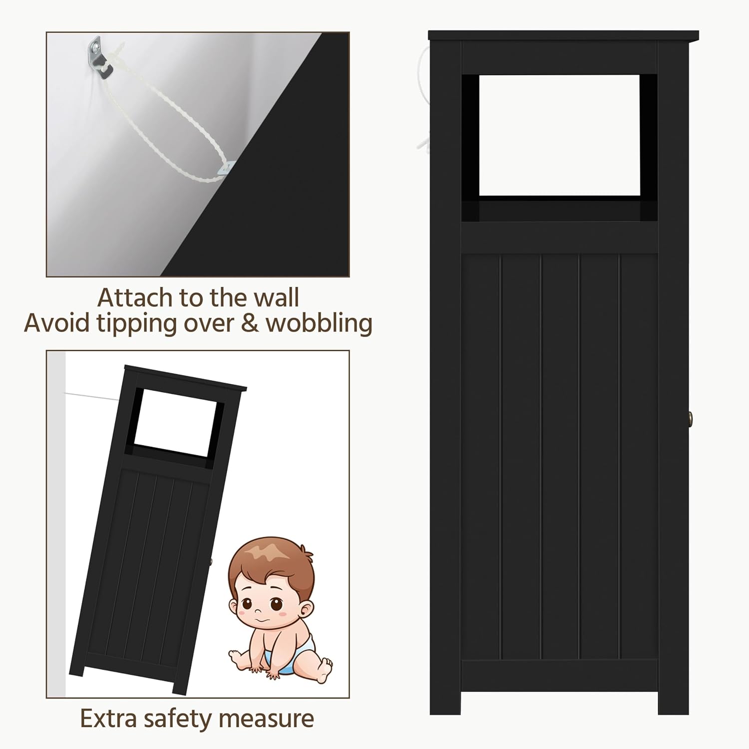 - Fissaggio al muro: Fissare la cinghia antiribaltamento sul retro del mobile e fissarla a un montante della parete per evitare che si ribalti.