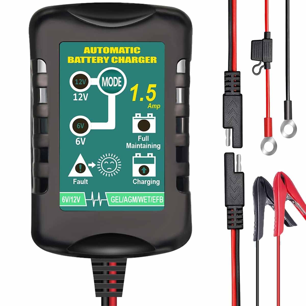 - Charge and Maintain: Provides 1.5A charging for both 6V and 12V SLA / VRLA / GEL / AGM / WET Lead Acid batteries.