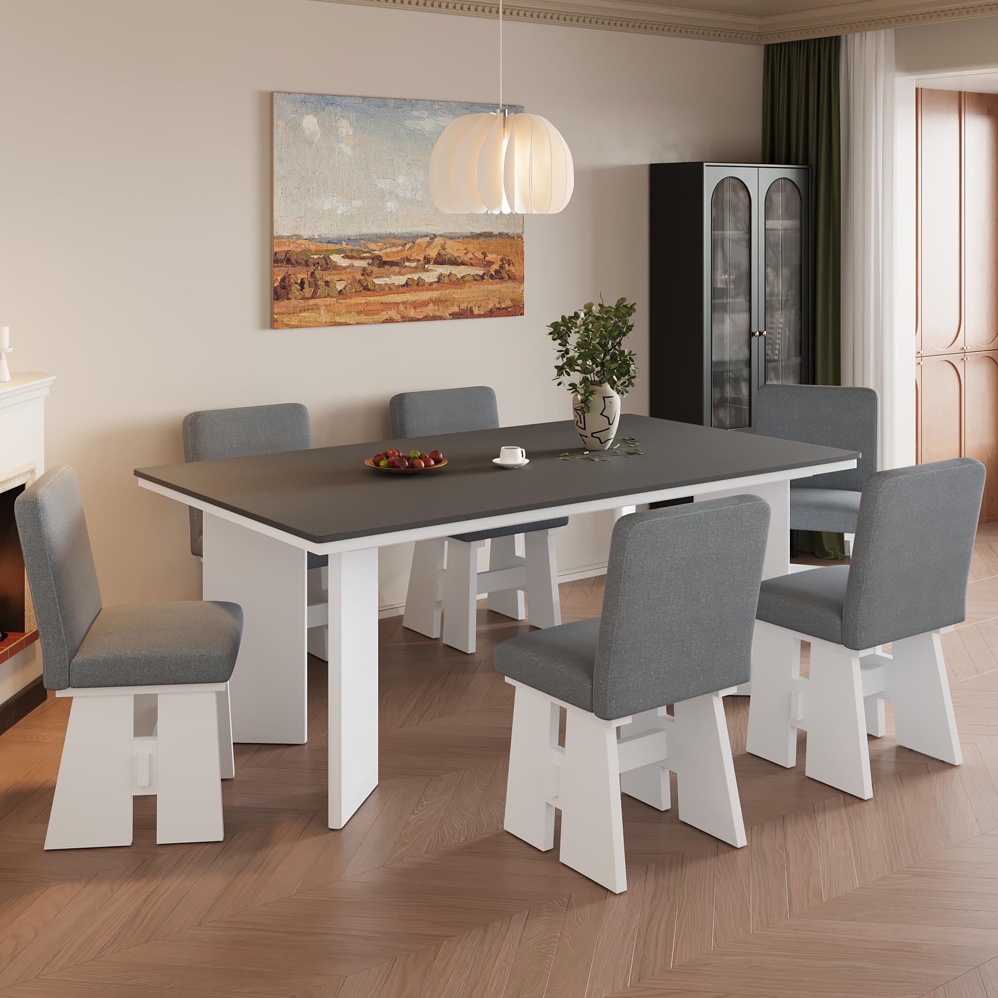 Image: The complete THINK 30 Modern 7-Piece Dining Table Set, featuring a dark gray tabletop and six upholstered chairs with white bases, arranged in a dining area.
