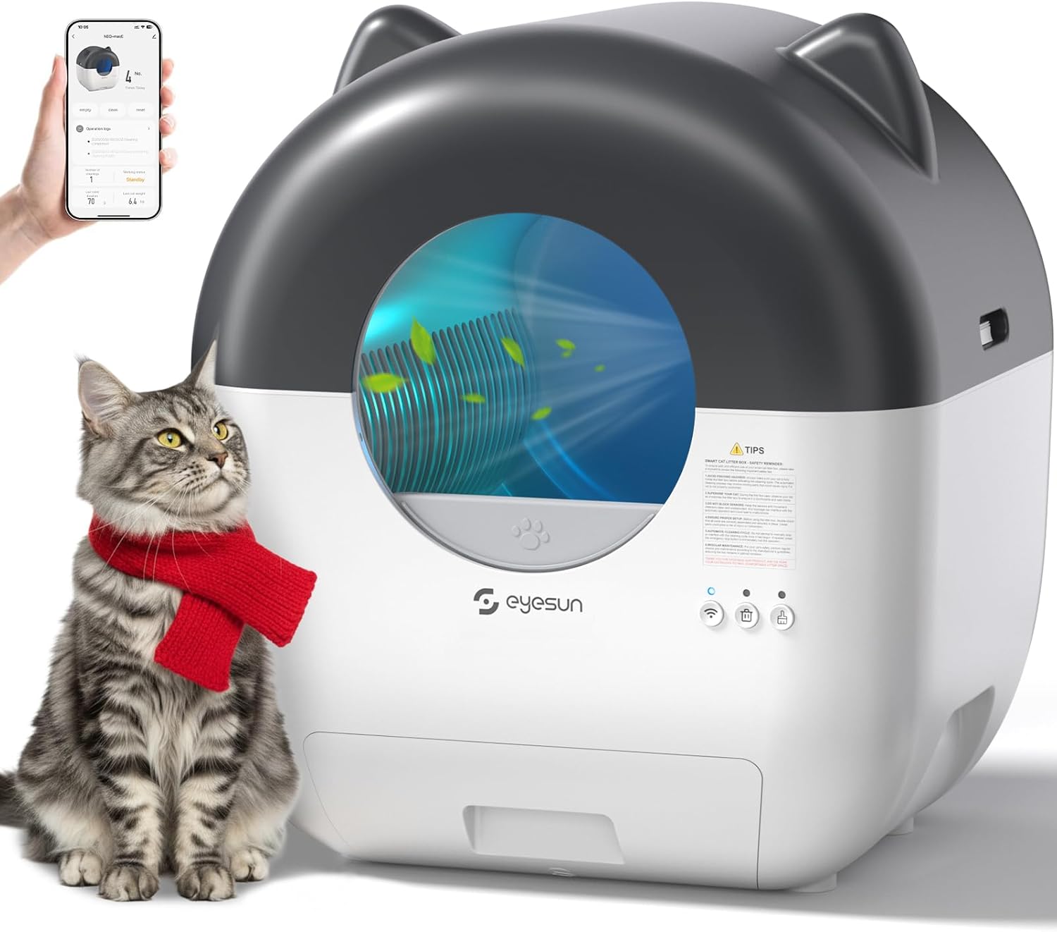 Figura 1: Lettiera per gatti automatica autopulente EYESUN con interfaccia app.