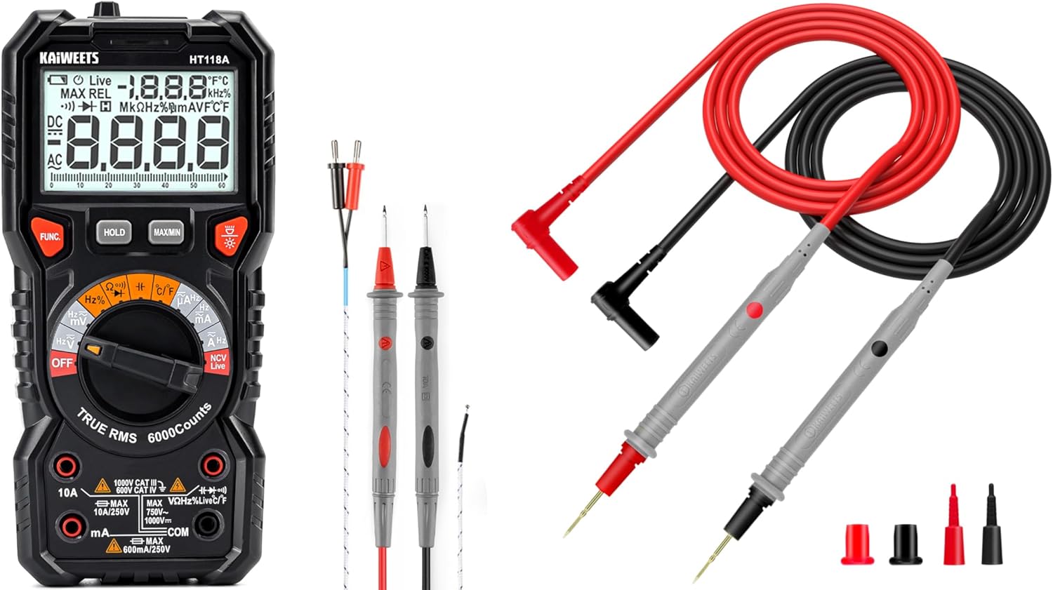 Figure 1: KAIWEETS HT118A Digital Multimeter and KET20 Test Leads. This image displays the HT118A multimeter on the left, featuring its large display and rotary dial, alongside the KET20 silicone test leads on the right, coiled and ready for use.