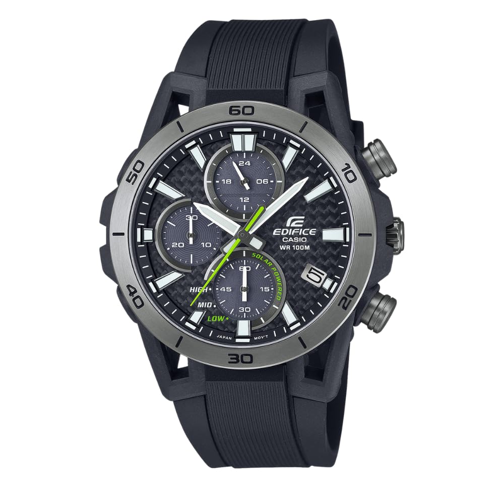 This manual provides essential instructions for the proper use and maintenance of your Casio Edifice EQS-960PB-1AVCR solar-powered chronograph watch. Please read this manual thoroughly to ensure optimal performance and longevity of your timepiece. The EQS-960PB-1AVCR combines solar power technology with chronograph functionality and a durable carbon-reinforced resin case, designed for reliability and precision.
