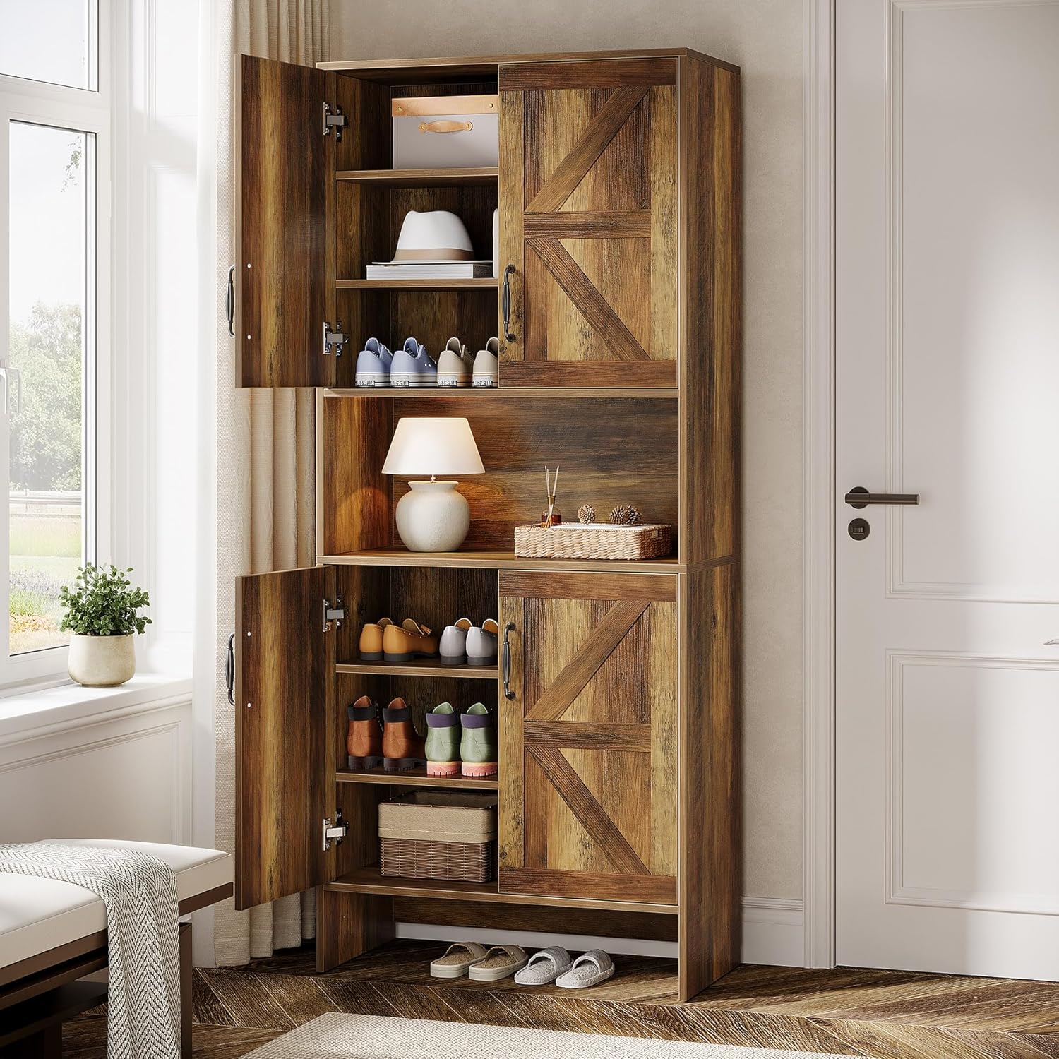 The Tribesigns Farmhouse Shoe Cabinet is designed for versatile storage in various rooms such as entryways, closets, living rooms, and bedrooms.