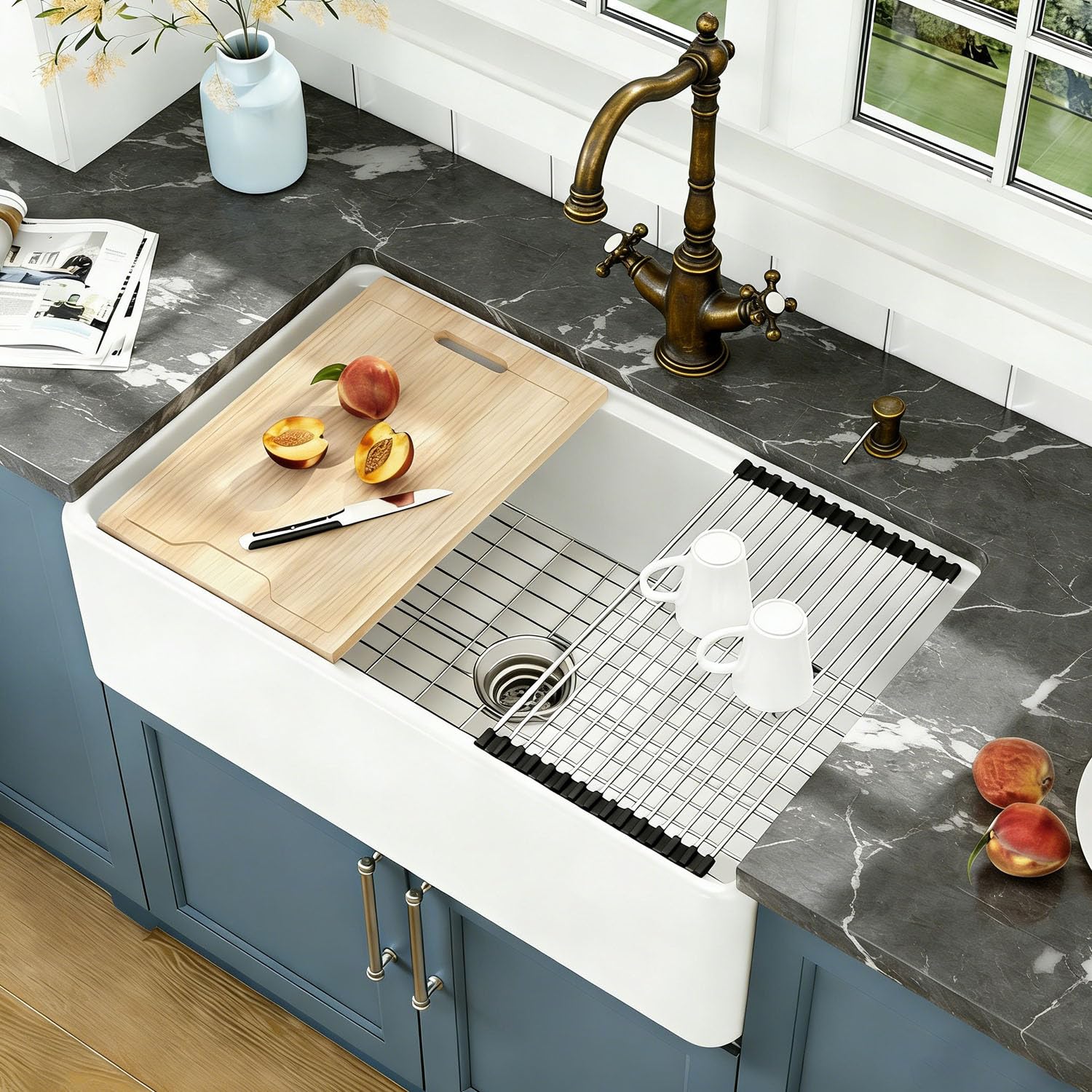 - Bottom Grid: Place the stainless steel protective grid at the bottom of the sink to protect the fireclay surface from scratches and impacts from dishes and cookware.