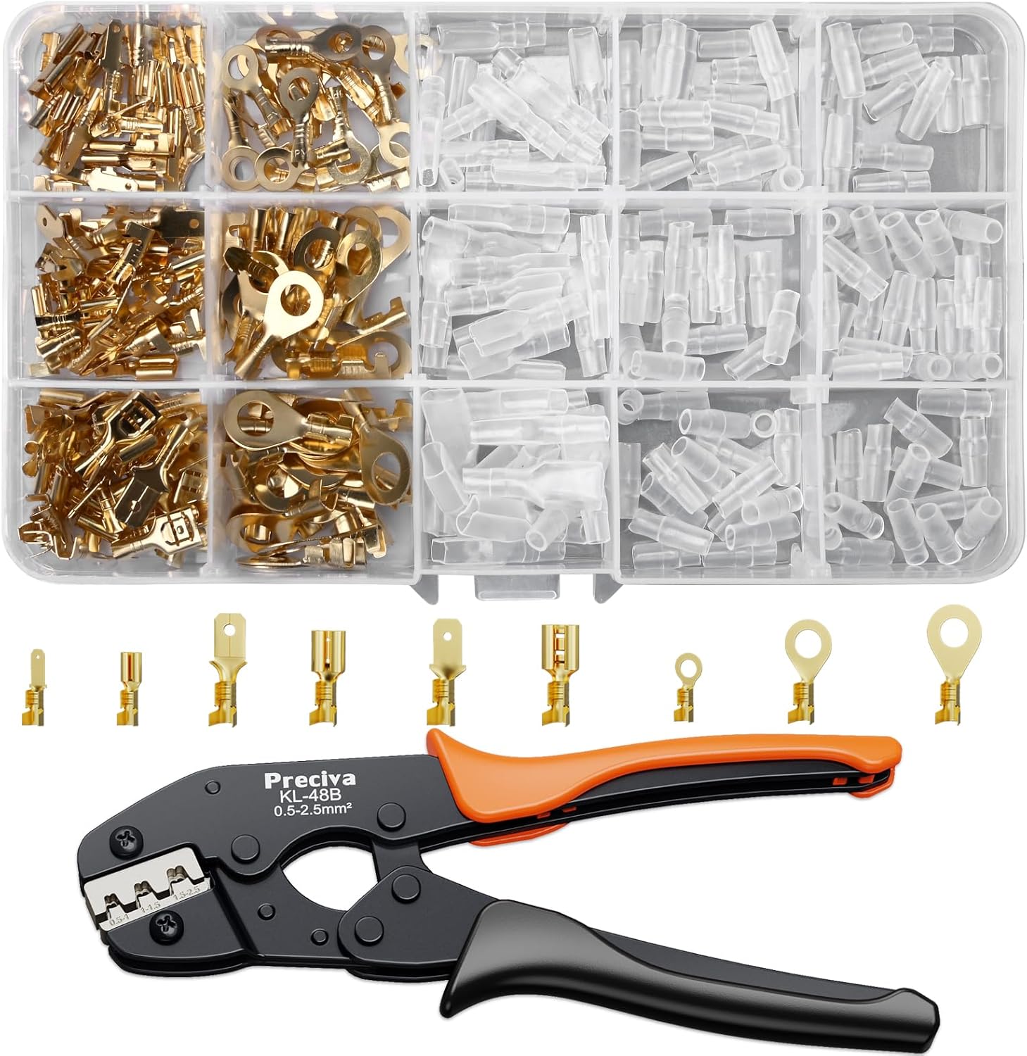 The complete kit includes the Preciva CP25360 crimping tool and a clear organizer box filled with various electrical terminals and insulation sleeves.