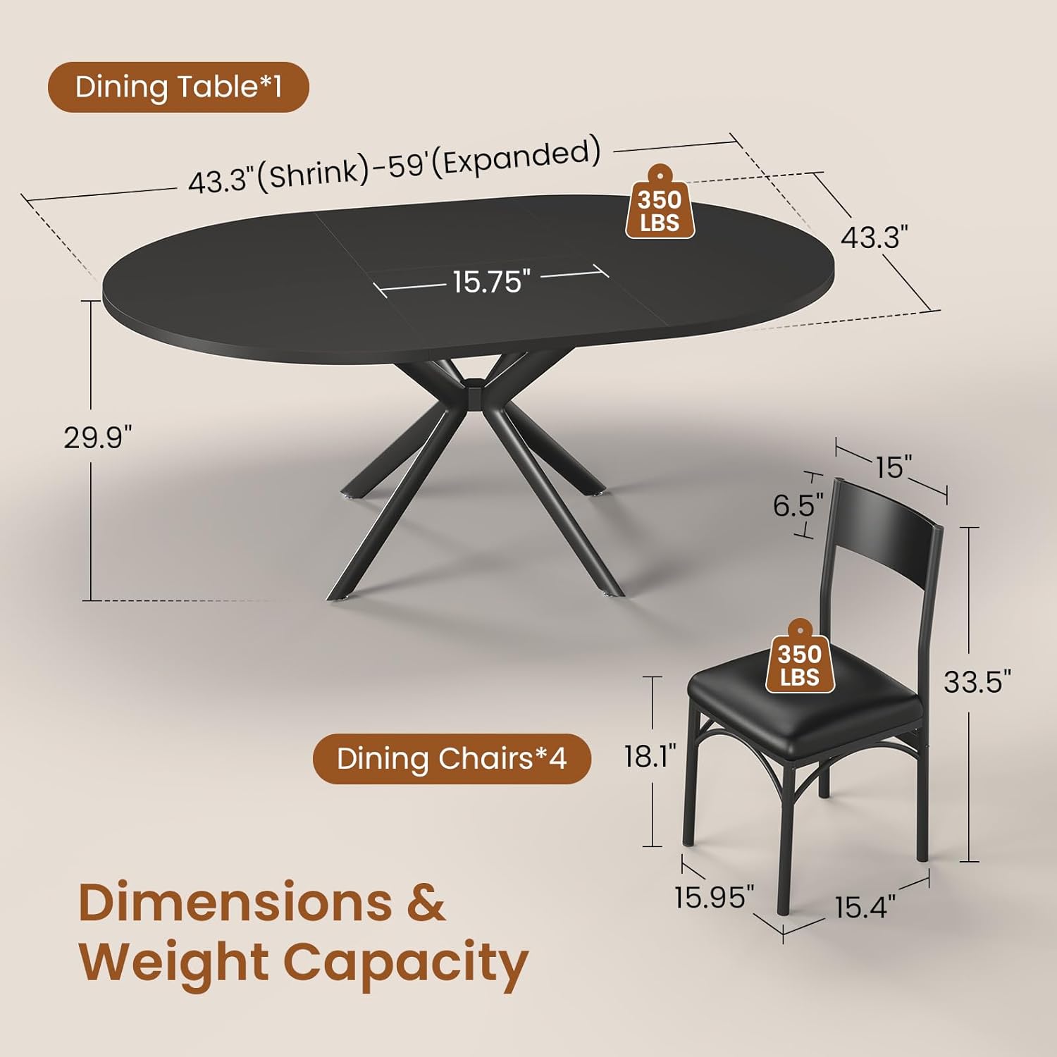 Image: Diagram illustrating the dimensions of the dining table (shrunk and expanded) and the dining chairs, including their respective weight capacities.